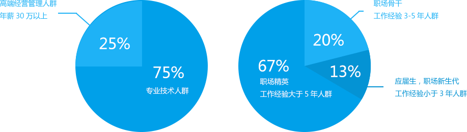英才網聯的專業人才庫中專業技術人群占比頗高,可見專業技術人群非常雄厚、充足。同時,對于企業客戶來講,應屆生、職場新生代、職場骨干、職場精英等人群可謂應有盡有,足夠滿足企業的日常招聘、專業崗位的招聘等需求。